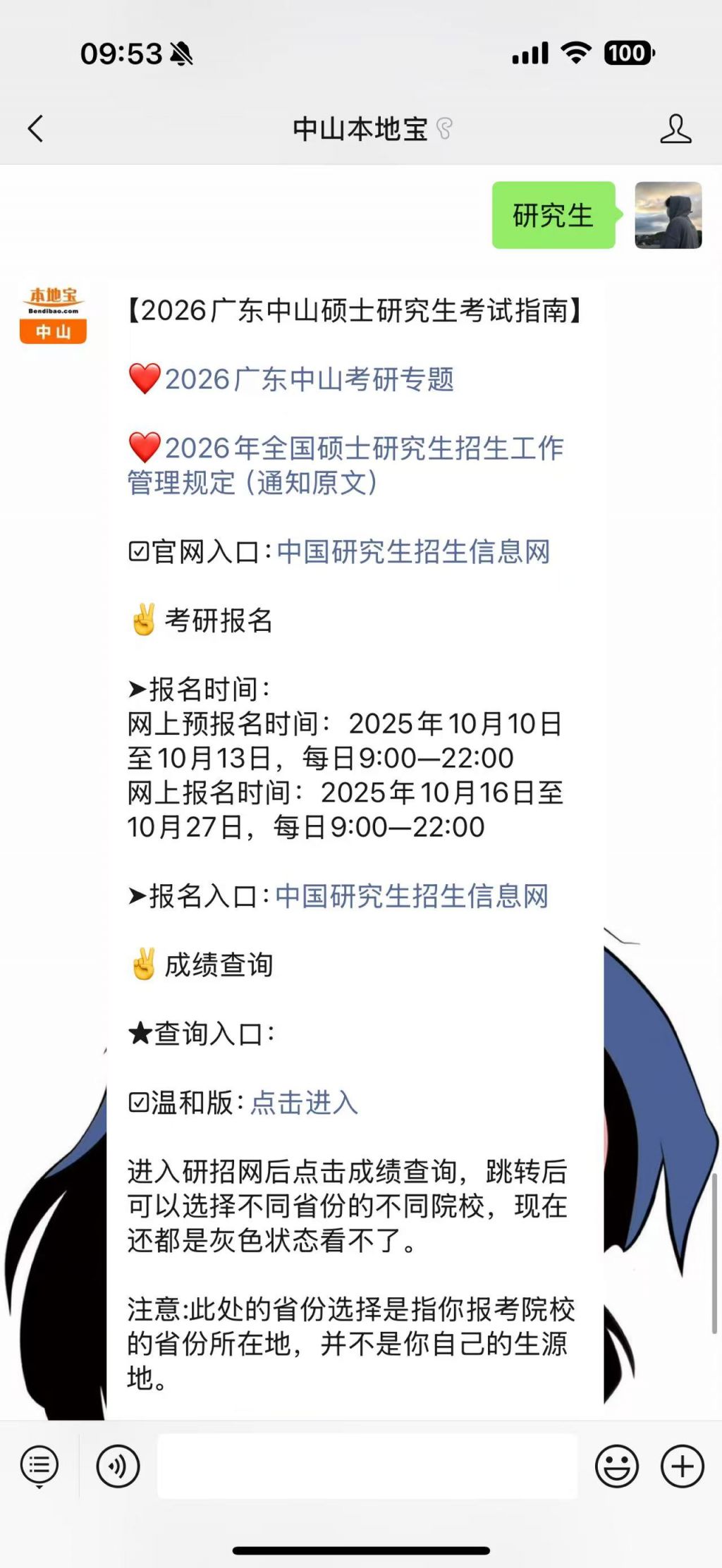 温馨提示:微信搜索公众号【中山本地宝】,关注后在对话框回复【研究生】可获取2026考研时间安排、报名入口及流程、报名攻略、考研专题服务、历年考研分数线、成绩查询入口、准考证打印、报考点安排等信息。